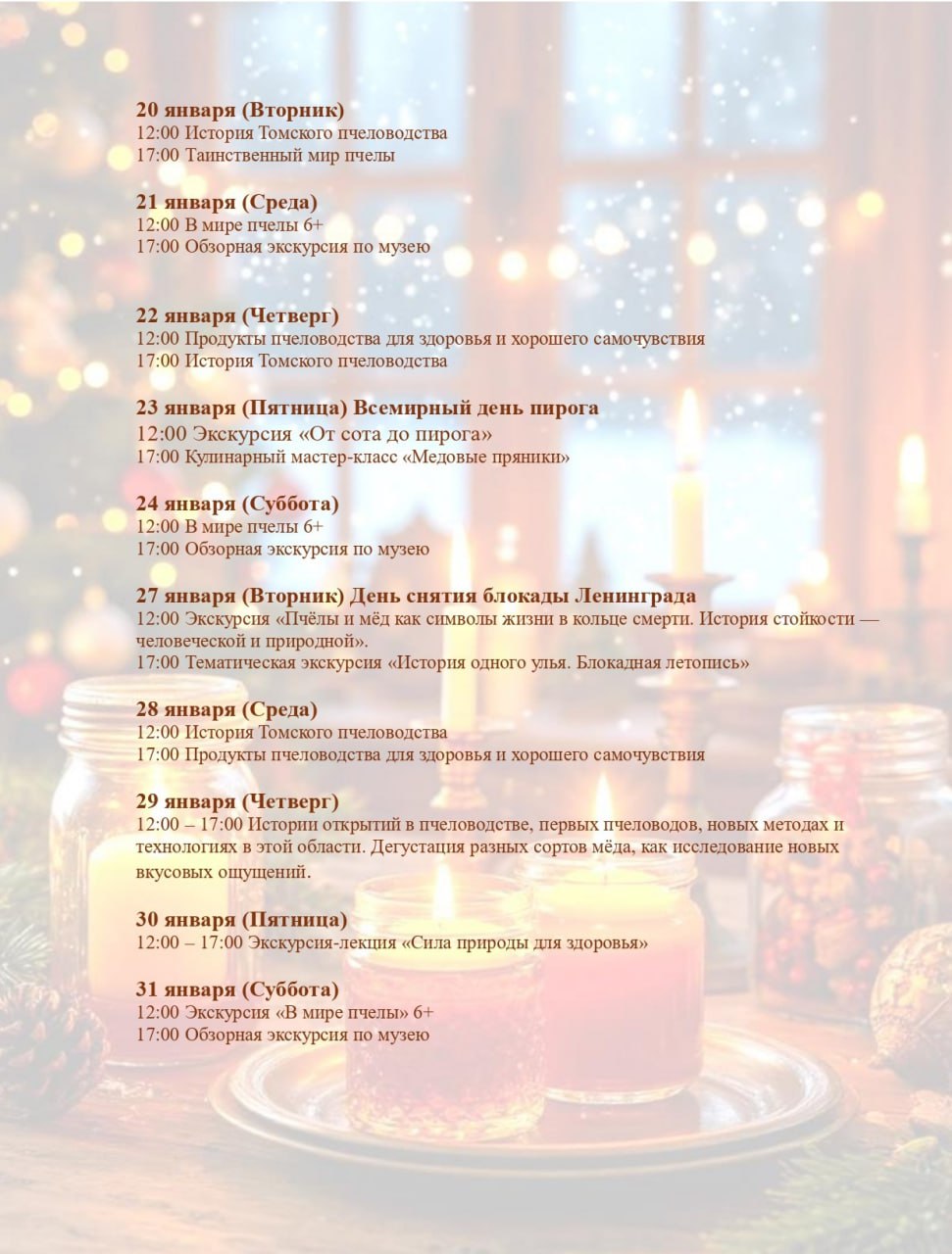 Друзья, мы подготовили для вас насыщенную программу на январь! В нашем музее меда «Пчелотека» вас ждут увлекательные экскурсии, творческие мастер-классы и, конечно, знакомство с удивительным миром пчел.